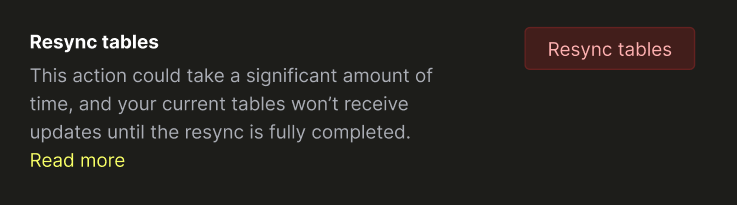 1. Вам может понадобиться выполнить значительные изменения схемы в исходных таблицах, которые поломают существующий ClickPipe, и его пришлось бы перезапускать. В этом случае вы можете просто нажать Resync после внесения изменений.